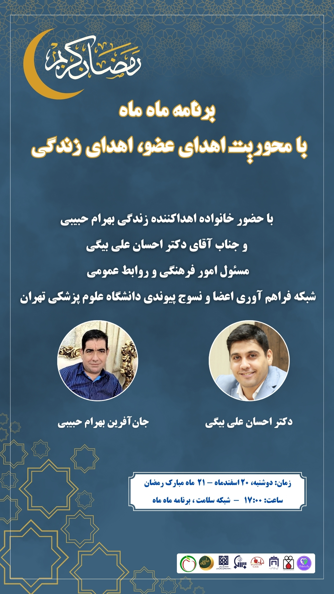 کد خبر : 318433 تاریخ انتشار : 1404/12/19 - 02:02 بازدیدکنندگان : 5 برنامه ماه ماه شبکه سلامت با محوریت اهدای عضو اهدای زندگی با حضور خانواده اهداکننده زندگی بهرام حبیبی و همراهی جناب آقای دکتر احسان علی بیگی مسئول امور فرهنگی و روابط عمومی شبکه فراهم آوری اعضا و نسوج پیوندی دانشگاه علوم پزشکی تهران کپی