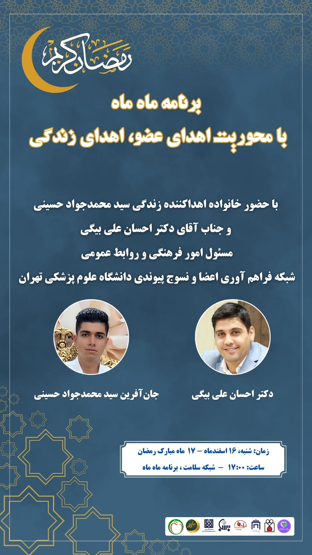 کد خبر : 316506 تاریخ انتشار : 1404/12/16 - 15:13 بازدیدکنندگان : 18 برنامه ماهماه شبکه سلامت با محوریت اهدای عضو اهدای زندگی با حضور خانواده اهداکننده زندگی سید محمدجواد حسینی و همراهی جناب آقای دکتر احسان علی بیگی مسئول امور فرهنگی و روابط عمومی شبکه فراهم آوری اعضا و نسوج پیوندی دانشگاه علوم پزشکی تهران کپی