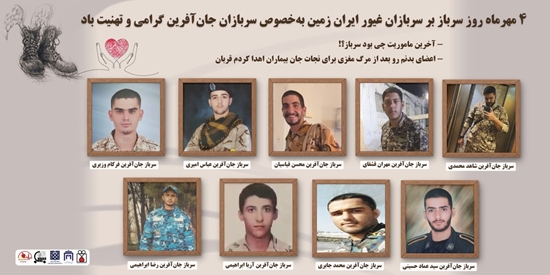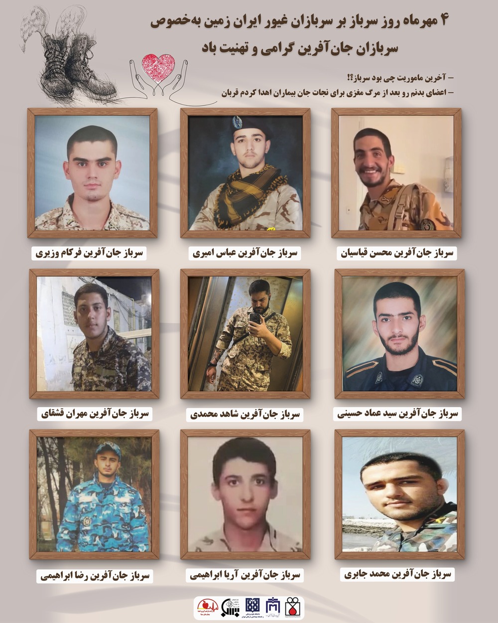 بر حافظان جان و ناموس و وطن، علی‌الخصوص سربازان خانواده‌ی بی‌ادعای اهدا و پیوند اعضا گرامی و تهنیت باد.